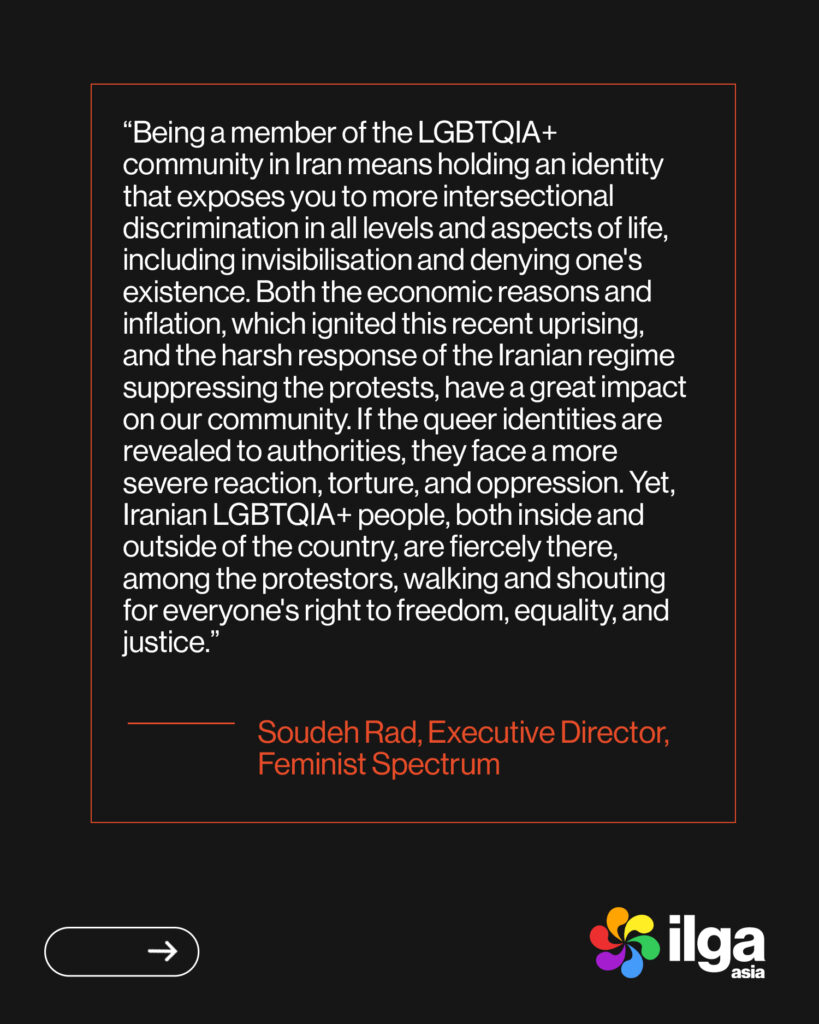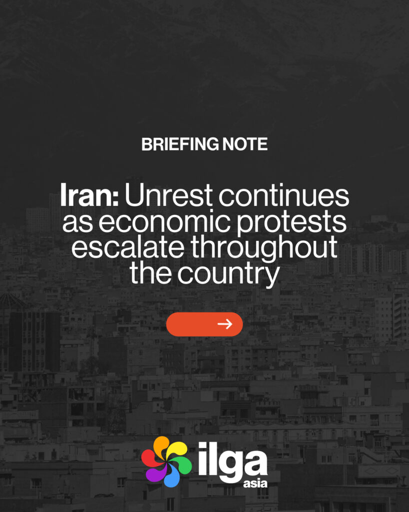 ILGA Asia is concerned by the protest crackdowns undertaken by the Iranian regime with excessive use of force against the protestors, the loss of human lives, and the internet blackout employed for the repression of freedom of expression and information in Iran. The UN has called this the “deadliest crackdown by the Government of Iran against its people” since 1979 and underscored the urgency of collecting evidence of alleged human rights violations, including to determine whether international crimes such as crimes against humanity may have occurred.