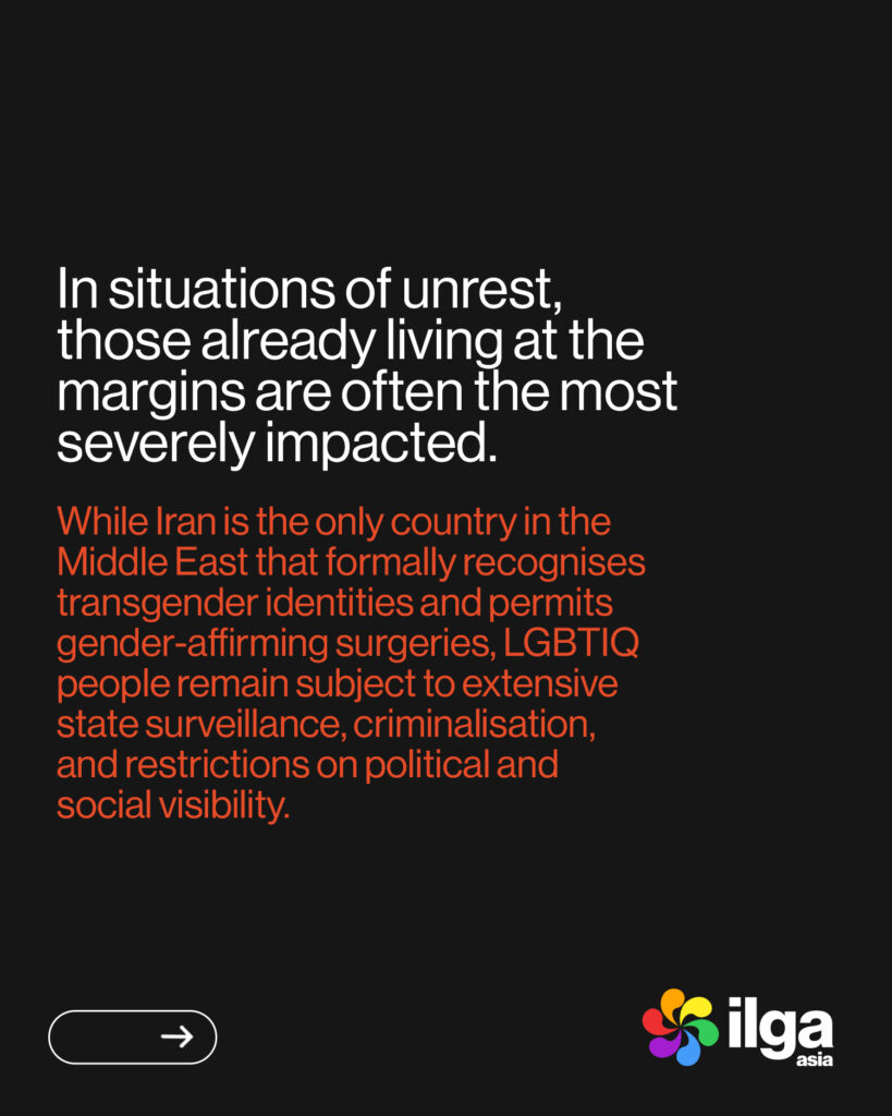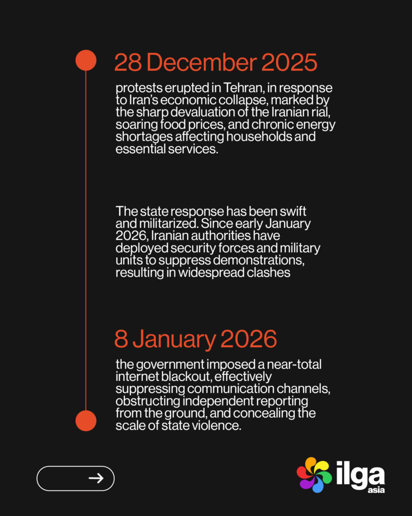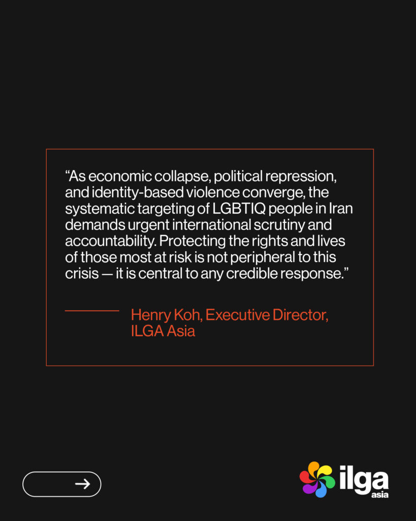 “As economic collapse, political repression, and identity-based violence converge, the systematic targeting of LGBTIQ people in Iran demands urgent international scrutiny and accountability. Protecting the rights and lives of those most at risk is not peripheral to this crisis — it is central to any credible response.” — Henry Koh, Executive Director, ILGA Asia