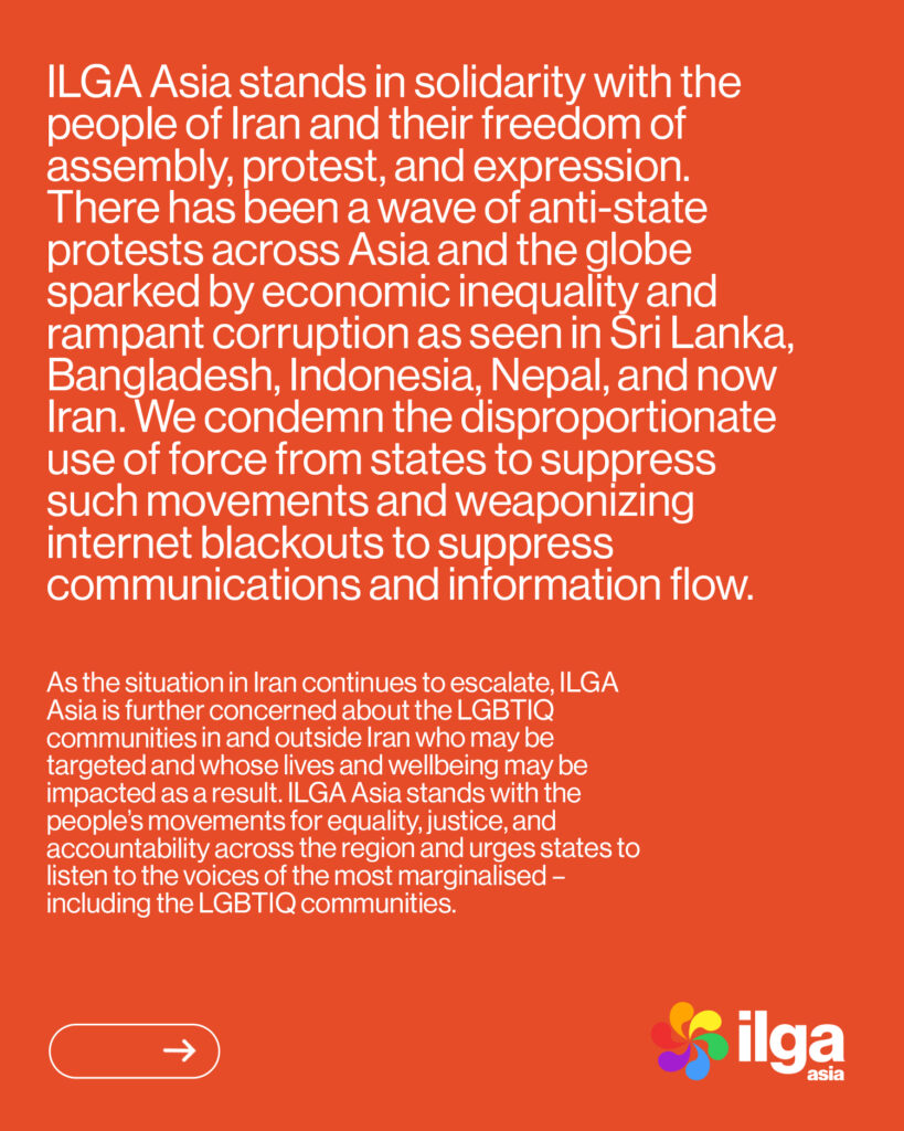ILGA Asia stands in solidarity with the people of Iran and their freedom of assembly, protest, and expression. There has been a wave of anti-state protests across Asia and the globe sparked by economic inequality and rampant corruption as seen in Sri Lanka, Bangladesh, Indonesia, Nepal, and now Iran. We condemn the disproportionate use of force from states to suppress such movements and weaponizing internet blackouts to suppress communications and information flow.
